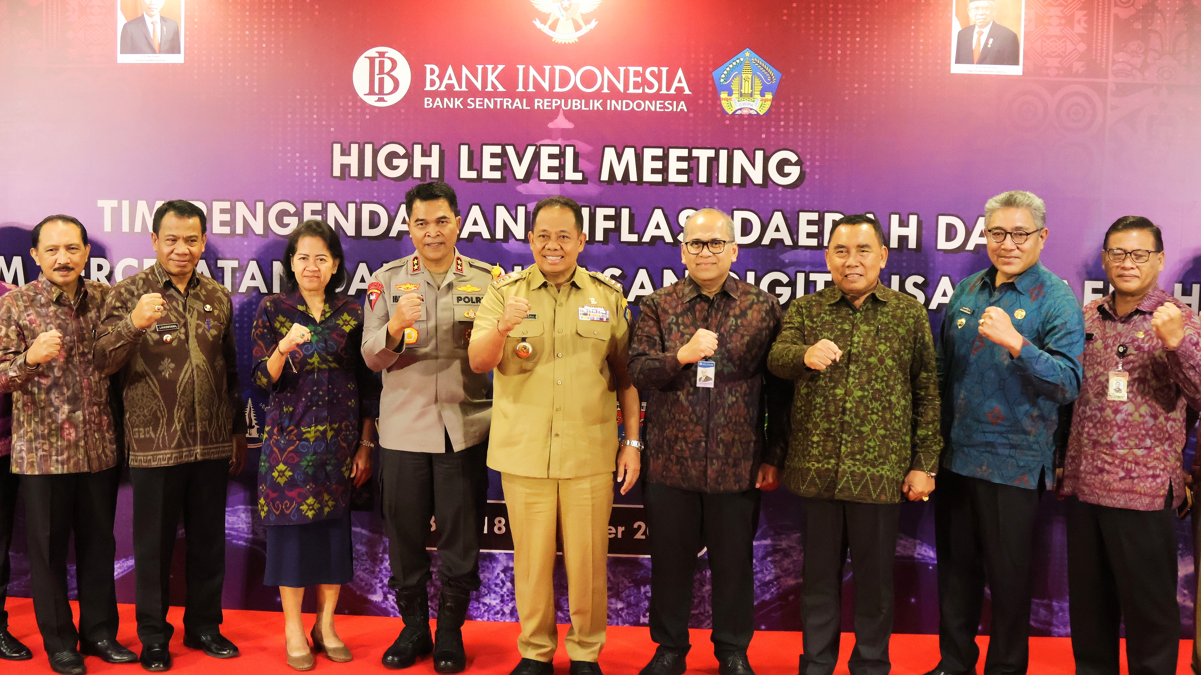 Denpasar – Pj. Gubernur Bali S.M. Mahendra Jaya memimpin High Level Meeting Tim Pengendalian Inflasi Daerah (TPID) Prov Bali dan Tim Percepatan dan Perluasan Digitalisasi Daerah (TP2DD) Provinsi Bali, bertempat di Ruang Tirta Empul Kantor Perwakilan BI Provinsi Bali, Denpasar, pada Senin (18/12).