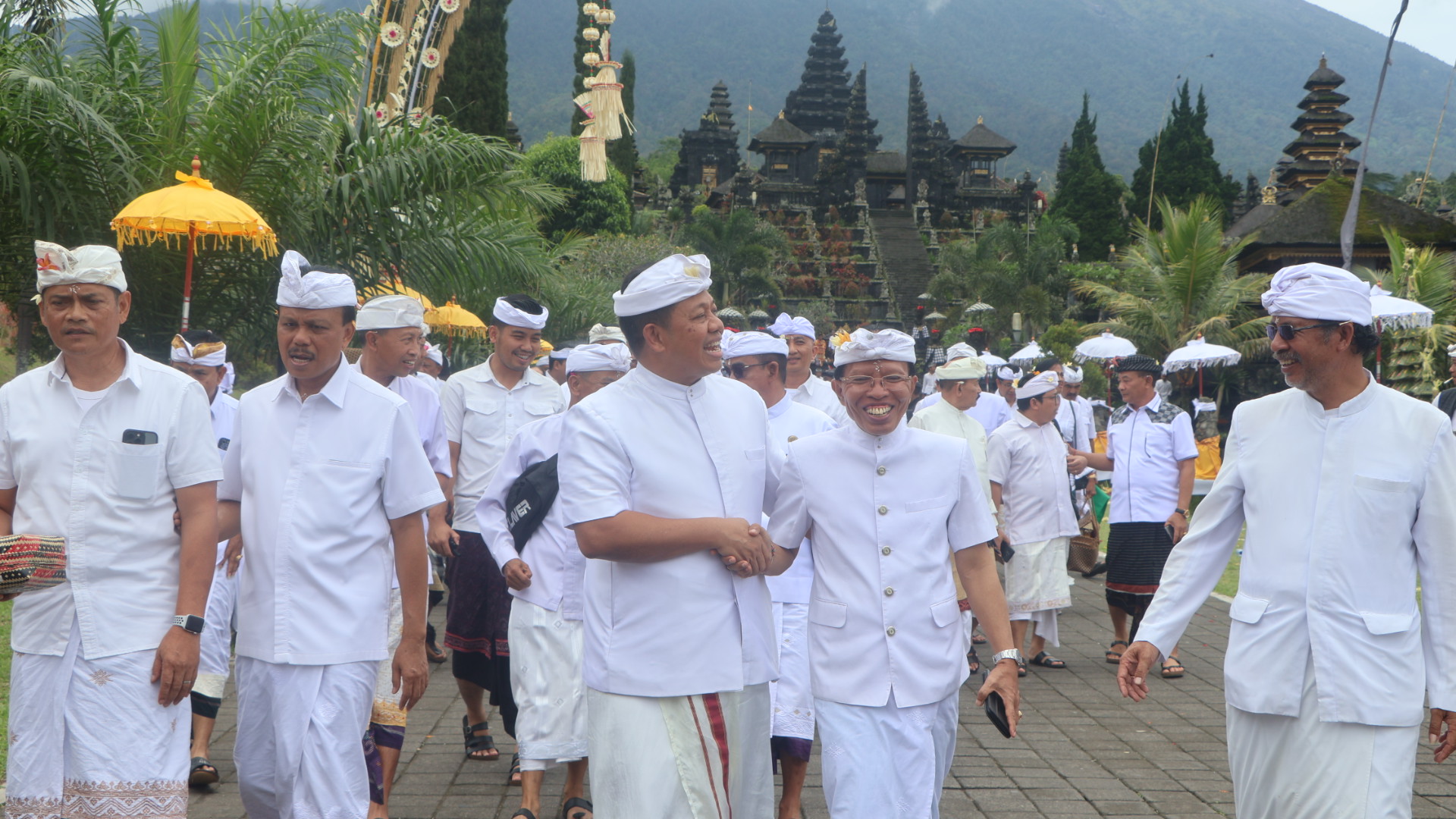 Karangasem - Pj. Gubernur Bali Sang Made Mahendra Jaya didampingi Sekretaris Daerah Provinsi Bali Dewa Made Indra dan Kepala Perangkat Daerah Pemerintah Provinsi Bali mengikuti prosesi dan Muspayang Bhakti Tawur Agung Kesanga Rahina Suci Nyepi Tahun Caka 1946 dan upacara Tawur Tabuh Gentuh serangkaian Karya Ida Bhatara Turun Kabeh (IBTK), di Pura Agung Besakih, Karangasem, Minggu (Redite Umanis Langkir) 10 Maret 2023.
