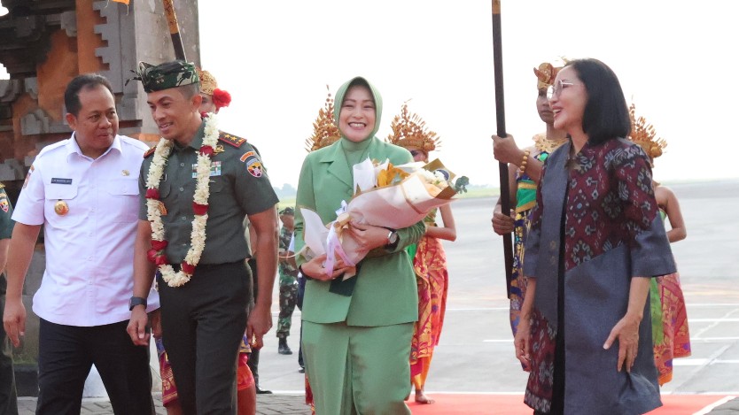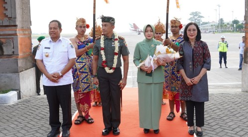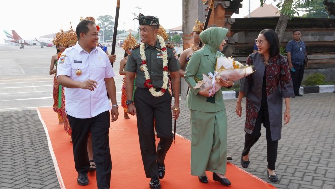 Pj. Gubernur Bali, S. M. Mahendra Jaya didampingi Ny. drg. Ida Mahendra Jaya menyambut Pangdam IX/ Udayana, Mayjen TNI Bambang Trisnohadi beserta Ketua Persit KCK Daerah IX/ Udayana, Ny. Dian Bambang Trisnohadi, di Base Ops Lanud, I Gusti Ngurah Rai , Tuban , Badung , Rabu(13/3)