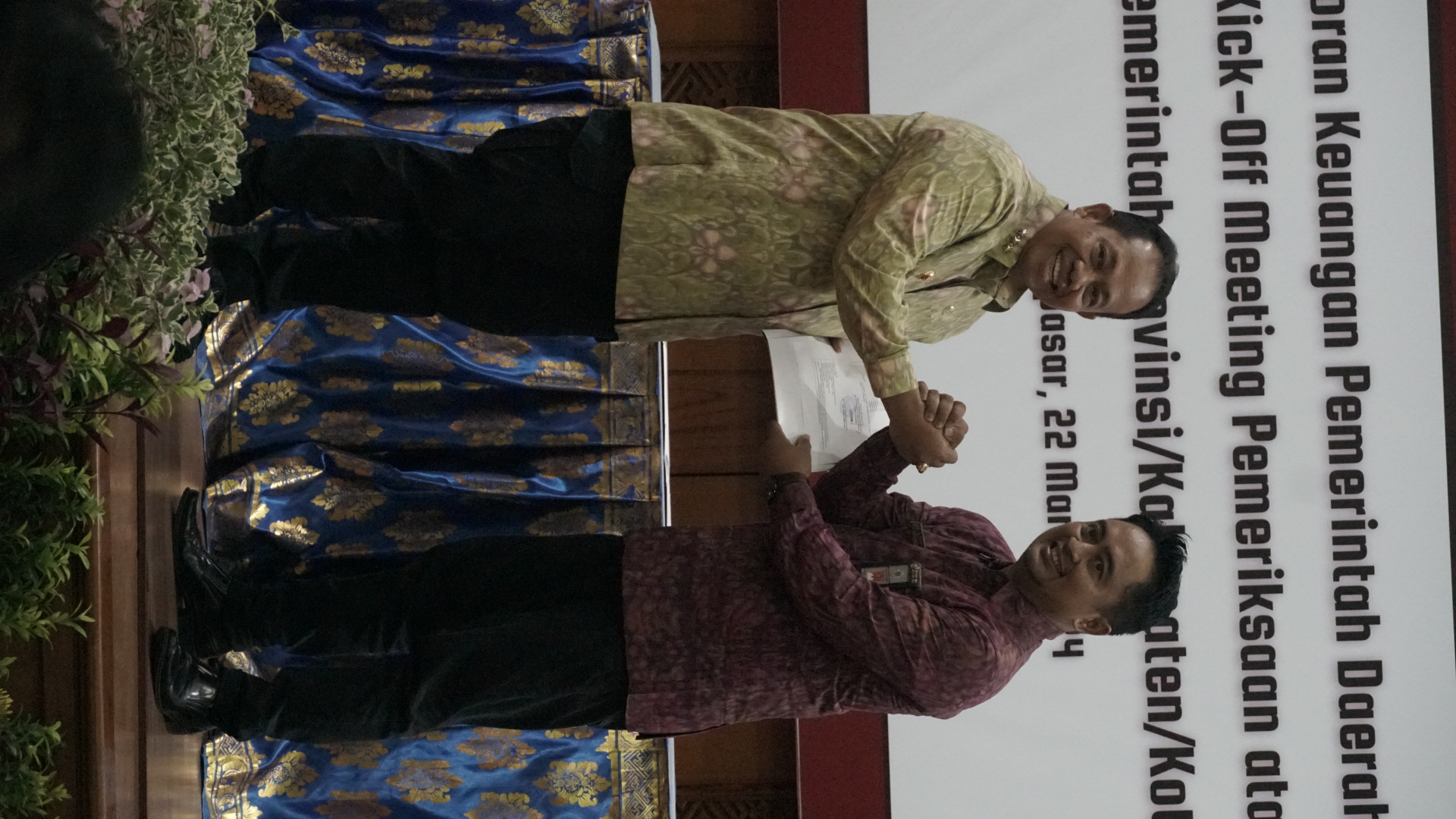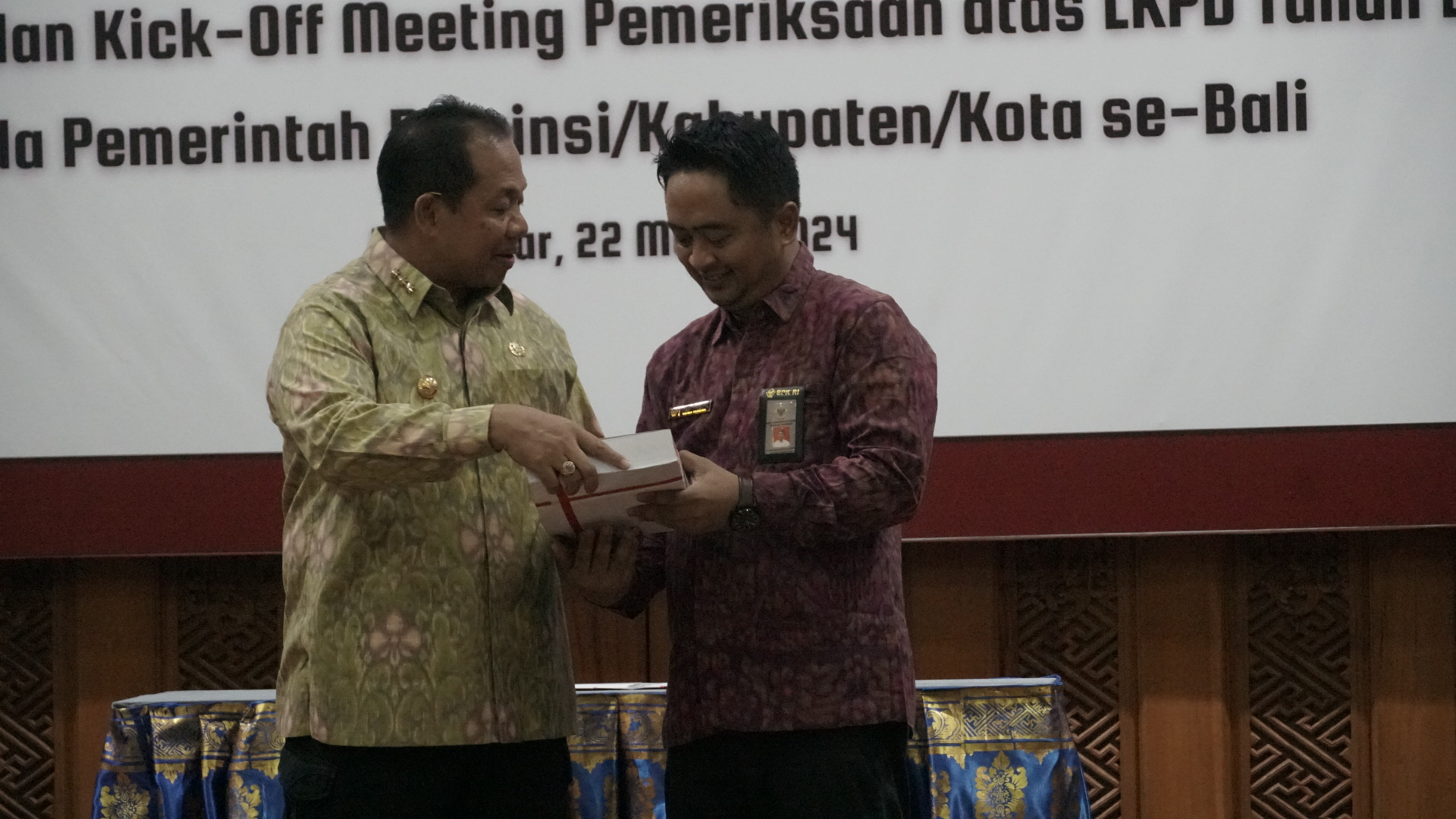 DENPASAR - Pj. Gubernur Bali, S.M. Mahendra Jaya menyerahkan Laporan Keuangan Pemerintah Daerah (LKPD) Unaudited Pemerintah Provinsi Bali Tahun 2023 kepada Kepala Perwakilan Badan Pemeriksa Keuangan (BPK) Bali, I Gusti Ngurah Satria Perwira dalam acara Penyerahan LKPD Unaudited Tahun 2023 dan Kick-Off Meeting Pemeriksaan atas LKPD Tahun 2023 pada Pemerintah Provinsi/ kabupaten/kota se- Bali, di Kantor BPK Provinsi Bali, Jumat (22/3).