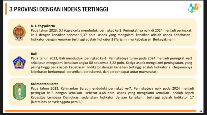 Peringkat 1 IDI Tahun 2024 diperoleh oleh Daerah Istimewa Yogyakarta, sedangkan di urutan ke 3 diperoleh oleh Provinsi Kalimantan Barat. Untuk kita ketahui bersama Indeks Demokrasi Indonesia (IDI) Provinsi Bali sebelumnya di Tahun 2023 tertinggi secara nasional, mencapai 85,13 (kategori baik) posisi I (terbaik) di antara provinsi lainnya di Indonesia. Capaian IDI Provinsi Bali di tahun 2023 menjadi pertama kalinya berada di peringkat teratas secara nasional.