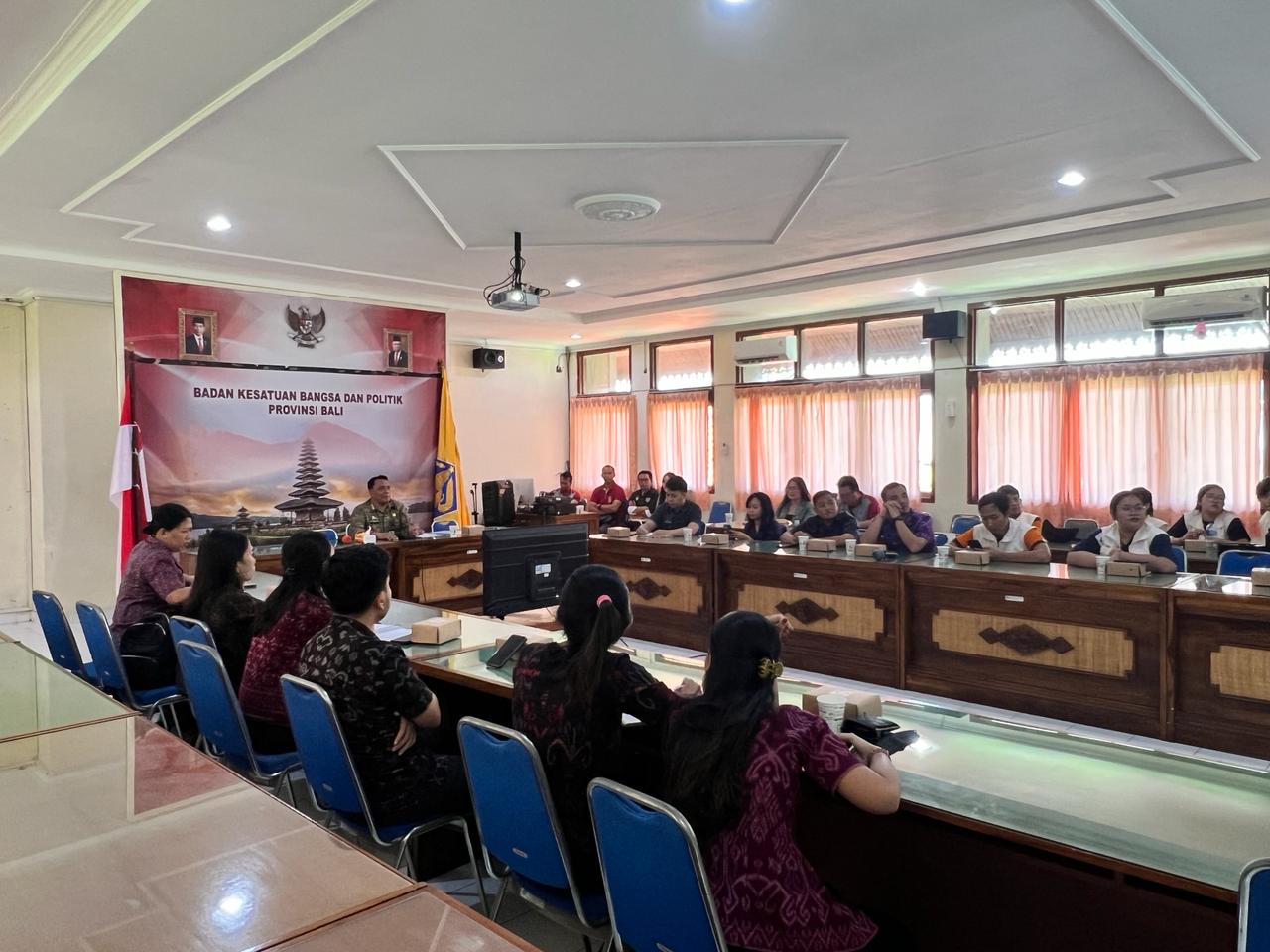 Jumat, 5 April 2024. Untuk memantapkan kesiapan Tim Kesehatan Seleksi dan Pelatihan PASKIBRAKA Provinsi Bali Tahun 2024, Badan Kesatuan Bangsa dan Politik (Kesbangpol) Provinsi Bali laksanakan Rapat Teknis bertempat di Ruang Rapat Utama Badan Kesbangpol Bali yang dipimpin oleh Kepala Bidang Ideologi, Wawasan Kebangsaan dan Karakter Bangsa, Drs. I Komang Kusumaedi, M.Si. dengan mengundang Kepala Dinas Kesehatan Provinsi Bali; Direktur Rumah Sakit Umum Daerah Bali Mandara Provinsi Bali; Kepala UPTD. Kesehatan Pengobatan Tradisional Dinas Kesehatan Provinsi Bali; Tim dari Dinas Kesehatan Provinsi Bali; Tim RSUD Bali Mandara Provinsi Bali; Tim UPTD. Kesehatan Pengobatan Tradisional Dinas Kesehatan Provinsi Bali.