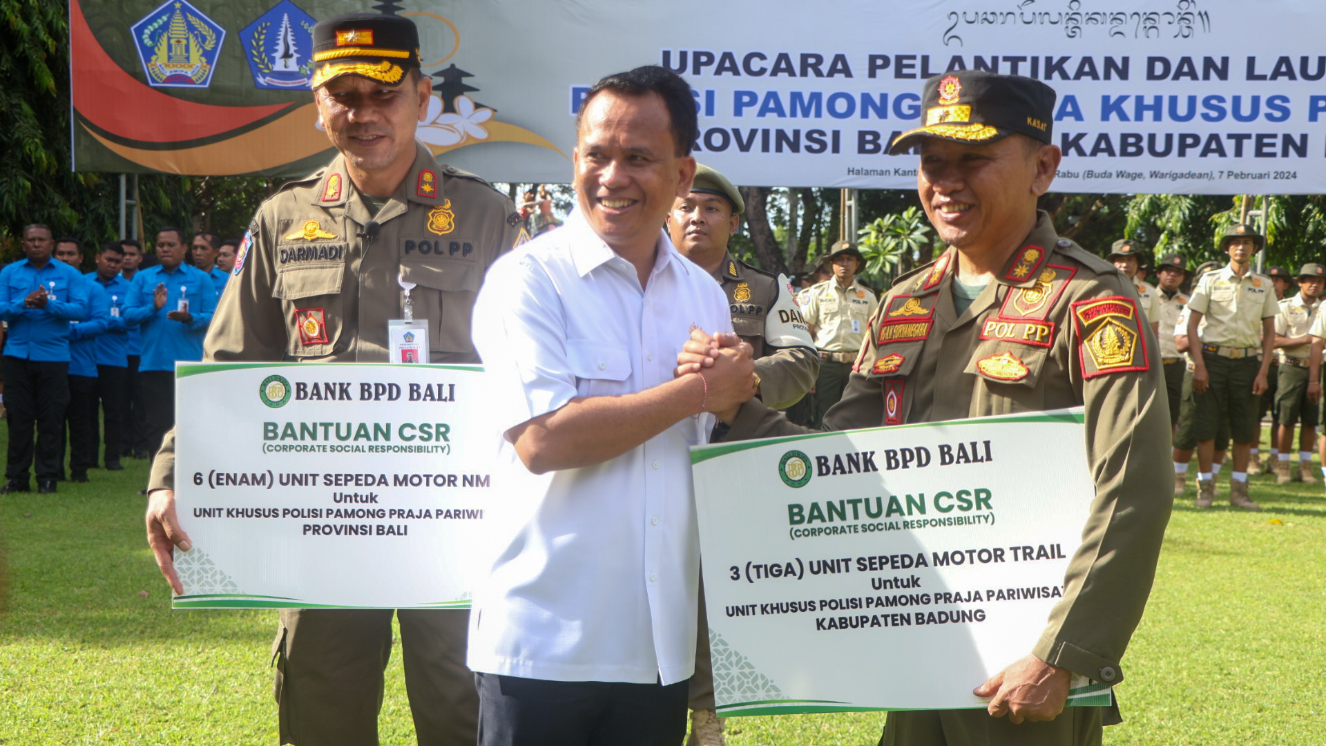 Pada kesempatan ini diserahkan secara simbolis sepeda motor untuk operasional sebanyak 6 unit kepada Satpol PP Khusus Pariwisata Provinsi Bali dan 3 unit kepada Satpol PP Khusus Pariwisata Kabupaten Badung bantuan CSR dari Bank BPD Bali.
