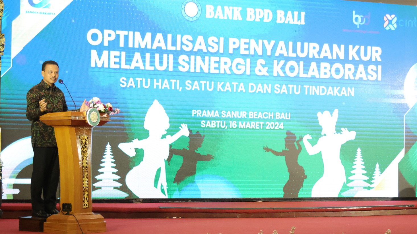 Sementara itu, Direktur Utama BPD Bali I Nyoman Sudharma dalam sambutannya menegaskan komitmen dalam penguatan sektor UMKM dan pertanian. Komitmen itu ditunjukkan dengan kesuksesan lembaga keuangan yang dipimpinnya dalam penyaluran KUR. Hingga bulan Februari 2024, BPD Bali berhasil menyalurkan 49 persen KUR bagi pelaku UMKM. "Ini telah melampaui target minimal 30 persen. Sehingga kami memperoleh insentif GWM dari BI," katanya. Untuk diketahui insentif GWM (Giro Wajib Minimum) diberikan kepada bank yang menyalurkan kredit ke sektor-sektor prioritas yang belum pulih, KUR dan kredit hijau.