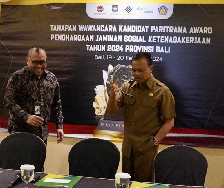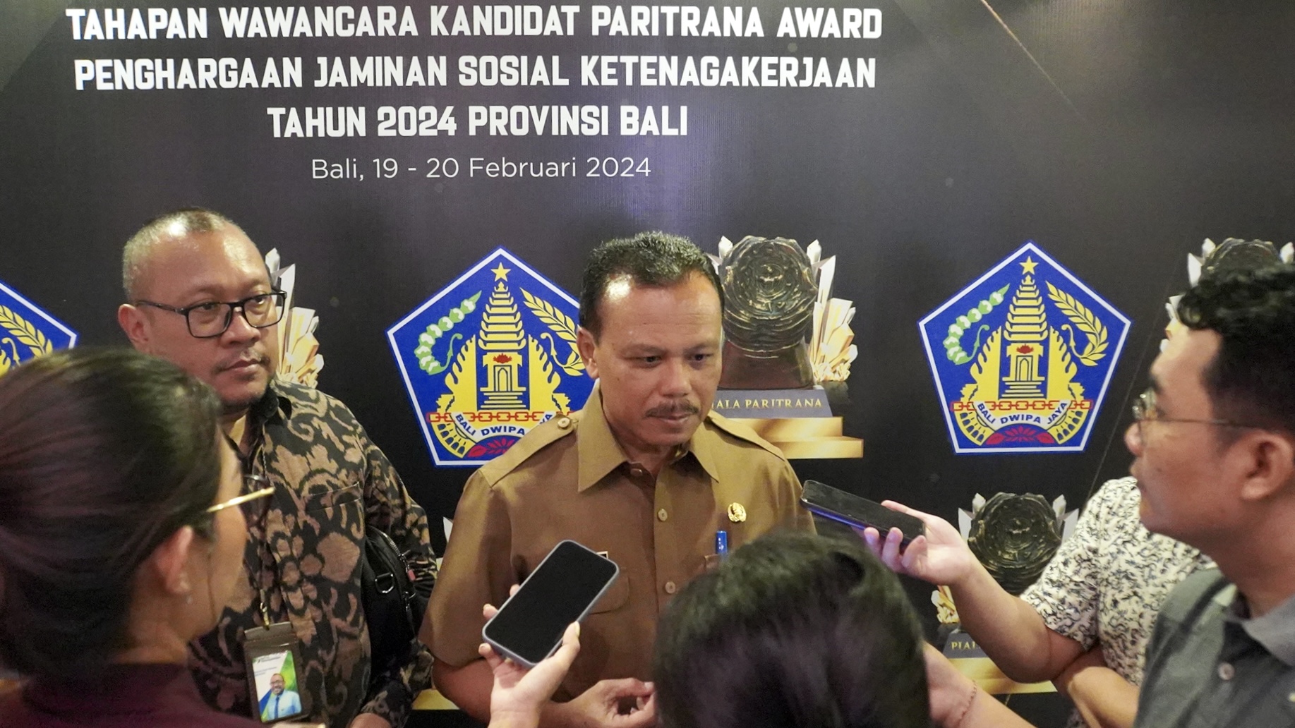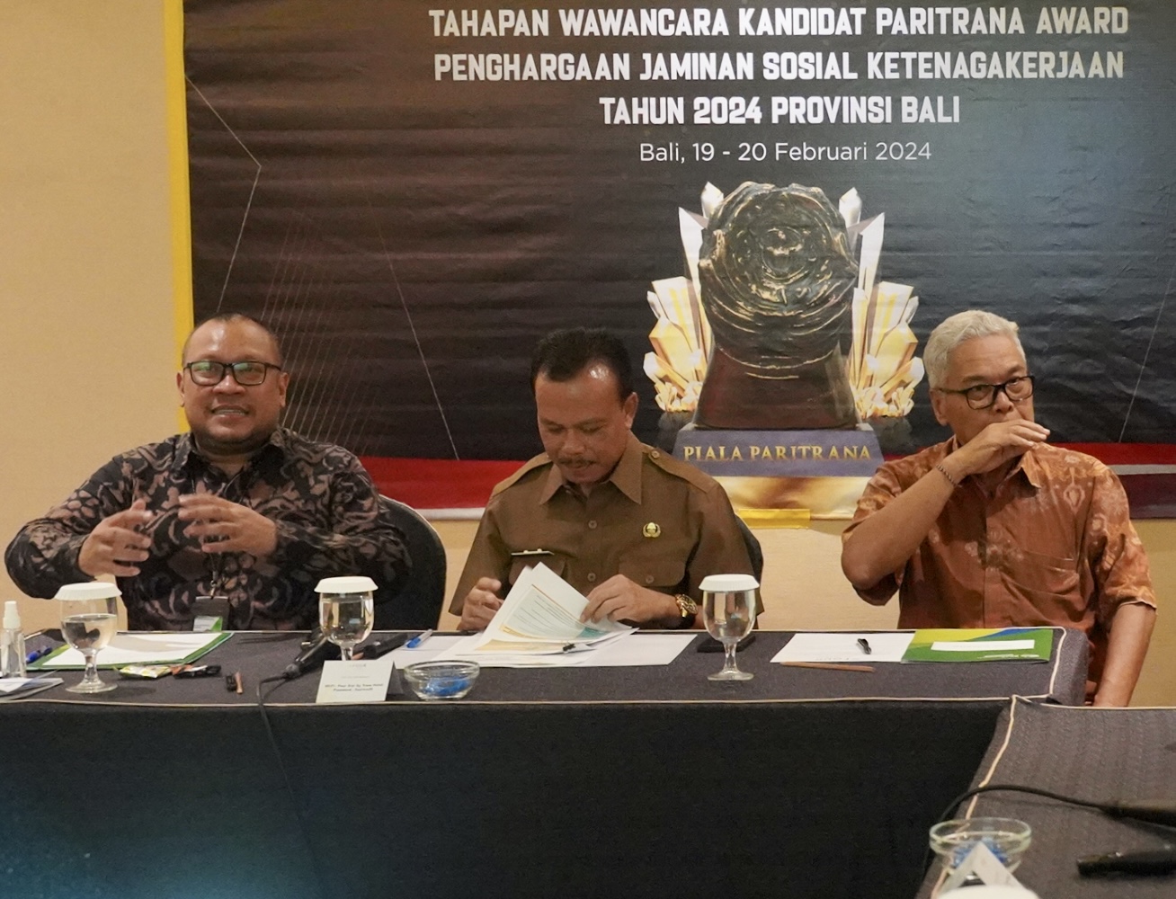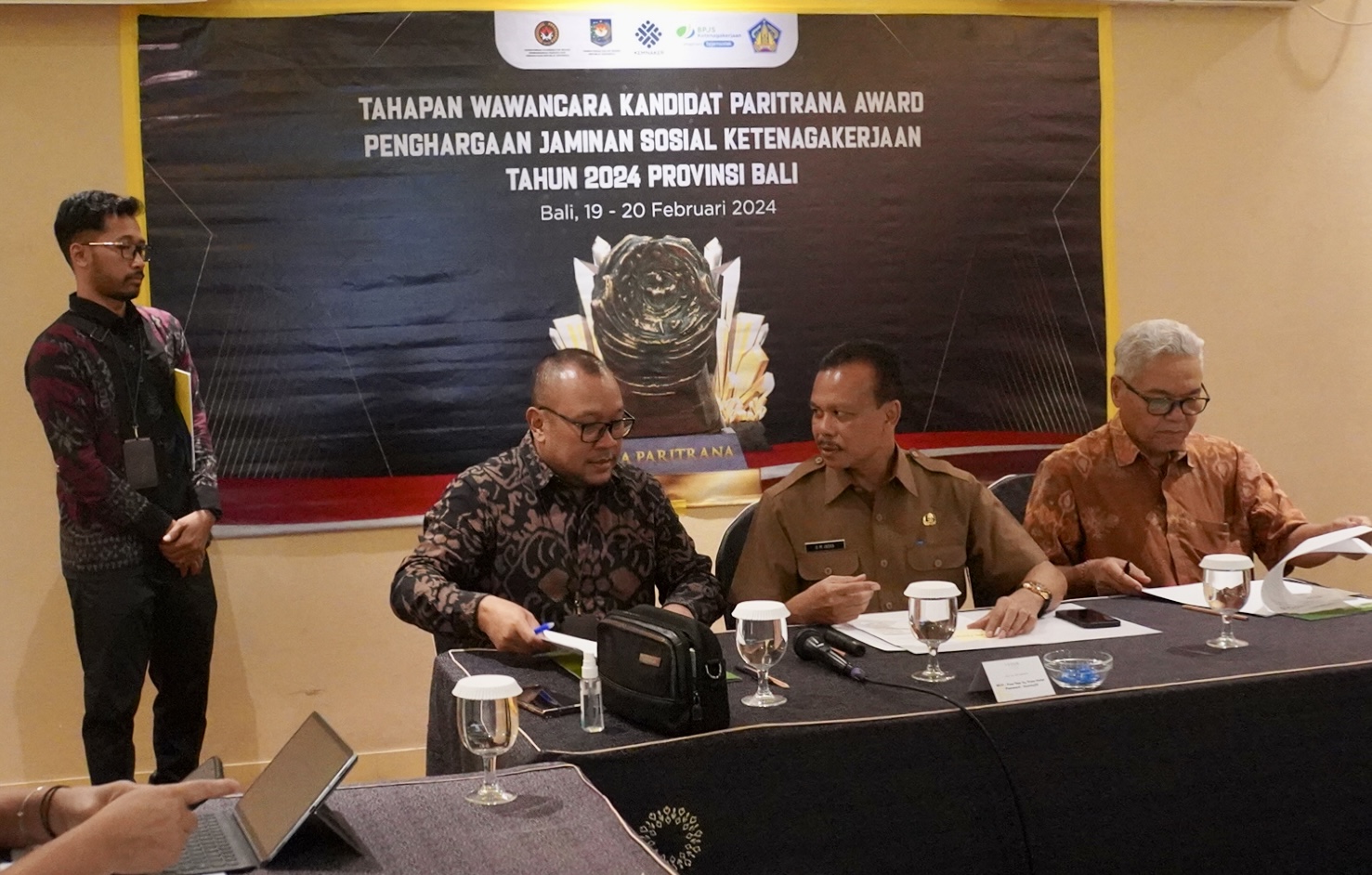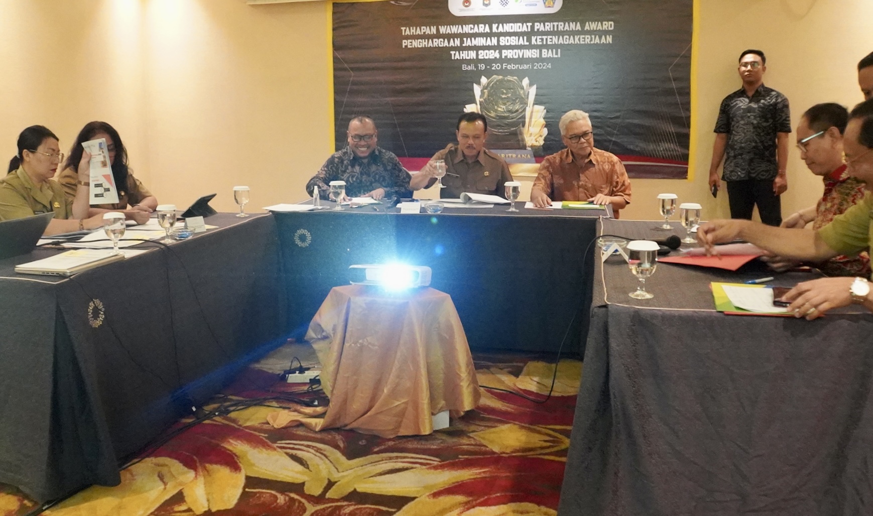 DENPASAR - Sekretaris Daerah Provinsi Bali Dewa Made Indra bersama beberapa anggota tim lainnya berkesempatan menjadi Tim Panelis Penghargaan Paritrana Award, melakukan wawancara langsung kepada seluruh kandidat bertempat di Hotel Four Star by Transhotel, Denpasar pada Senin (19/2), yang meliputi kategori pemerintah daerah dari kabupaten/kota yang diwakili Kepala Daerah masing-masing daerah serta kandidat pimpinan dari kategori perusahaan/badan usaha dari beberapa sektor.
