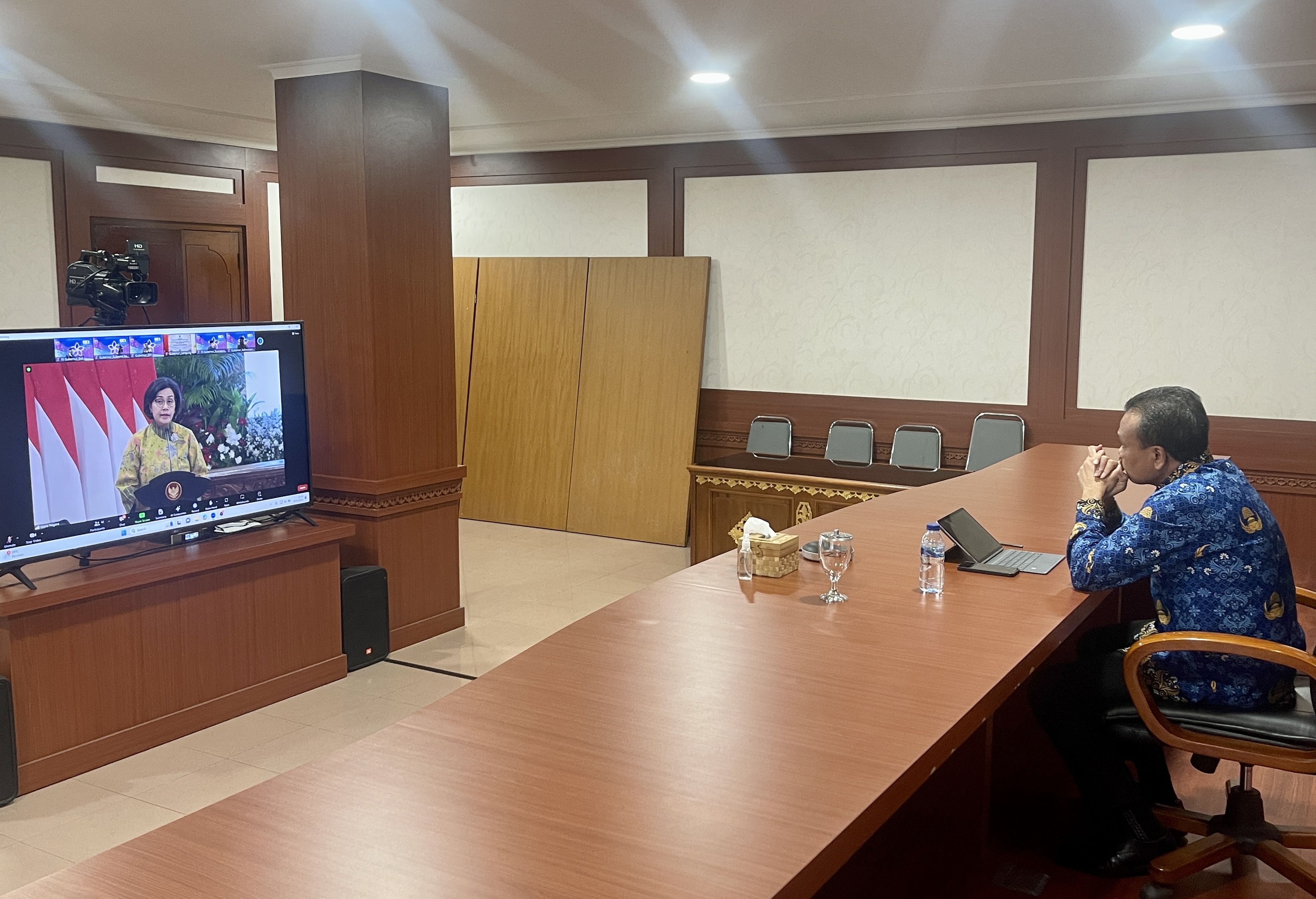Sekretaris Daerah (Sekda) Dewa Made Indra mewakili Pj. Gubernur Bali menerima Daftar Isian Pelaksanaan Anggaran (DIPA) dan Daftar Alokasi Transfer ke Daerah (TKD) 2024 secara daring di Ruang Vidcon 1, Kantor Gubernur Bali, Denpasar, pada Kamis (29/11).