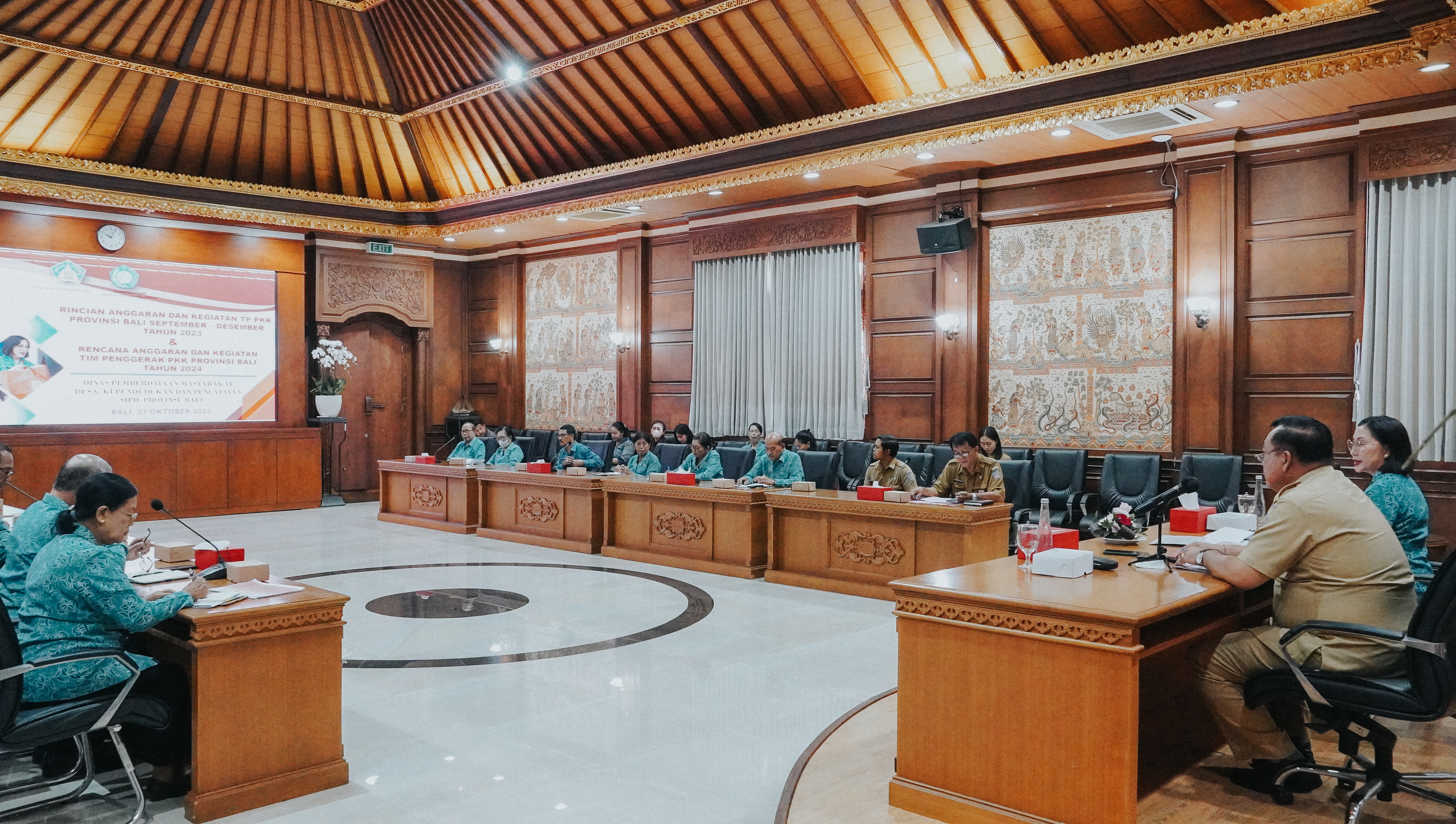 Penjabat (Pj.) Ketua Tim Penggerak PKK Provinsi Bali Ny. drg. Ida Mahendra Jaya, menggelar Rapat bersama Pengurus TP PKK Provinsi Bali guna membahas Rencana Kegiatan PKK Triwulan ke IV Tahun 2023 dan Persiapan Kegiatan Tahun 2024 sebagai tindak lanjut dari Rapat Koordinasi Nasional PKK Tahun 2023, rapat tersebut bertempat di Gedung Gajah, Jayasabha-Denpasar pada Senin (23/10).