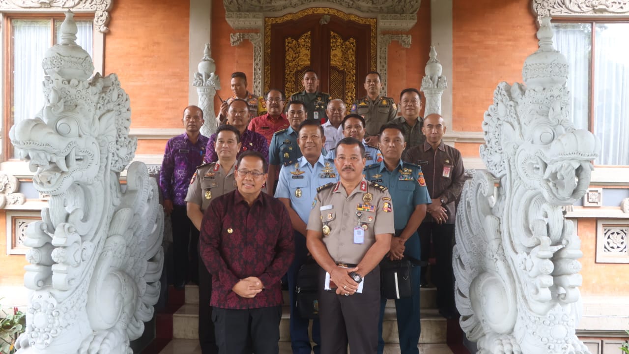 DENPASAR - PJ. Gubernur Bali S.M Mahendra Jaya didampingi Kepala Badan Kesbangpol Provinsi Bali, I Gusti Ngurah Wiryanata, Kepala Satpol PP Provinsi Bali I Dewa Nyoman Rai Darmadi, Kepala Pelaksana BPBD Provinsi Bali I Made Rentin, Kepala Dinas PMD Dukcapil Provinsi Bali Putu Anom Agustina dan Kepala Dinas Kominfos Provinsi Bali I Gede Pramana menerima kunjungan kerja On The Spot (OTS) Prioritas Nasional ke Provinsi Bali oleh Tim Sekretariat Dewan Ketahanan Nasional, di Wiswa Sabha Pratama, Selasa (23/1).