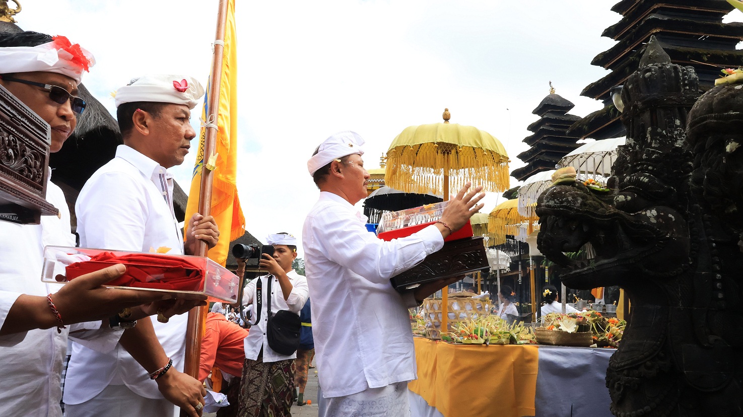 Karangasem - Masih dalam suasana Bulan Kebangsaan Provinsi Bali Tahun 2024, Senin, 12 Agustus 2024 Badan Kesbangpol Provinsi Bali bersama Badan Kesbangpol Kabupaten/Kota se-Bali melaksanakan Upacara Pasupati Duplikat Bendera Merah Putih bertempat di Pura Penatararan Agung, Pura Besakih.