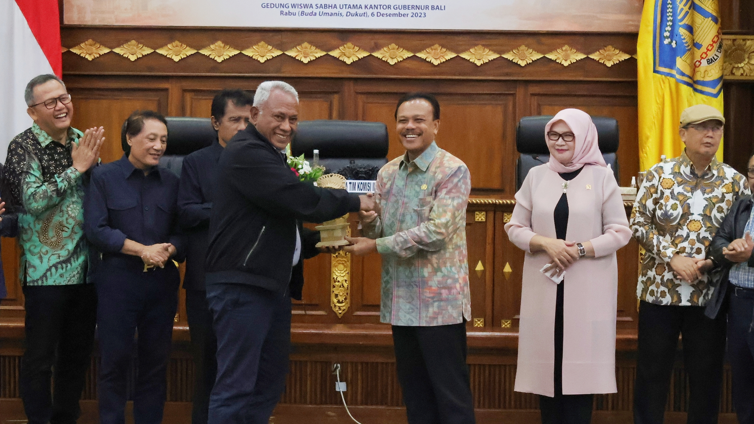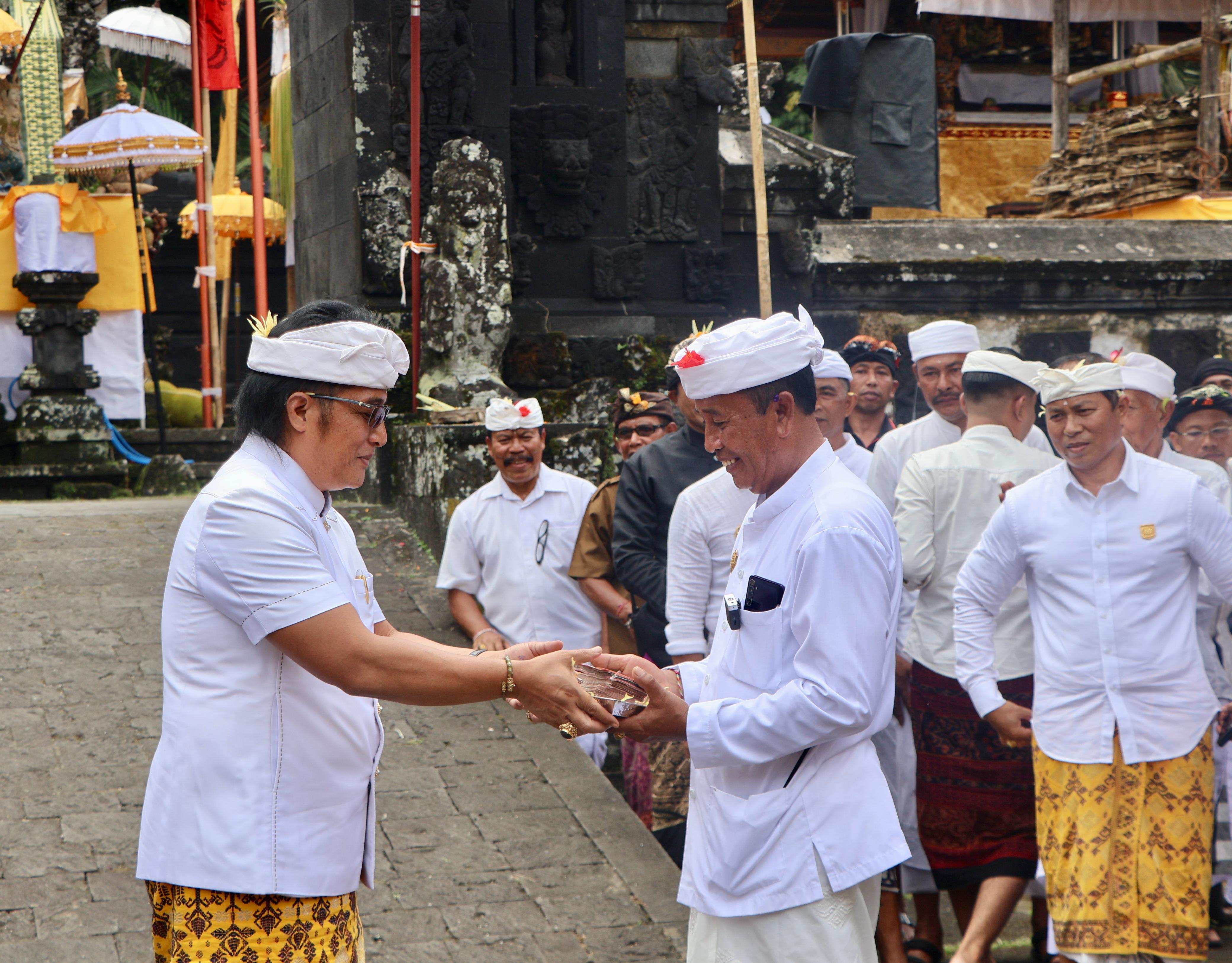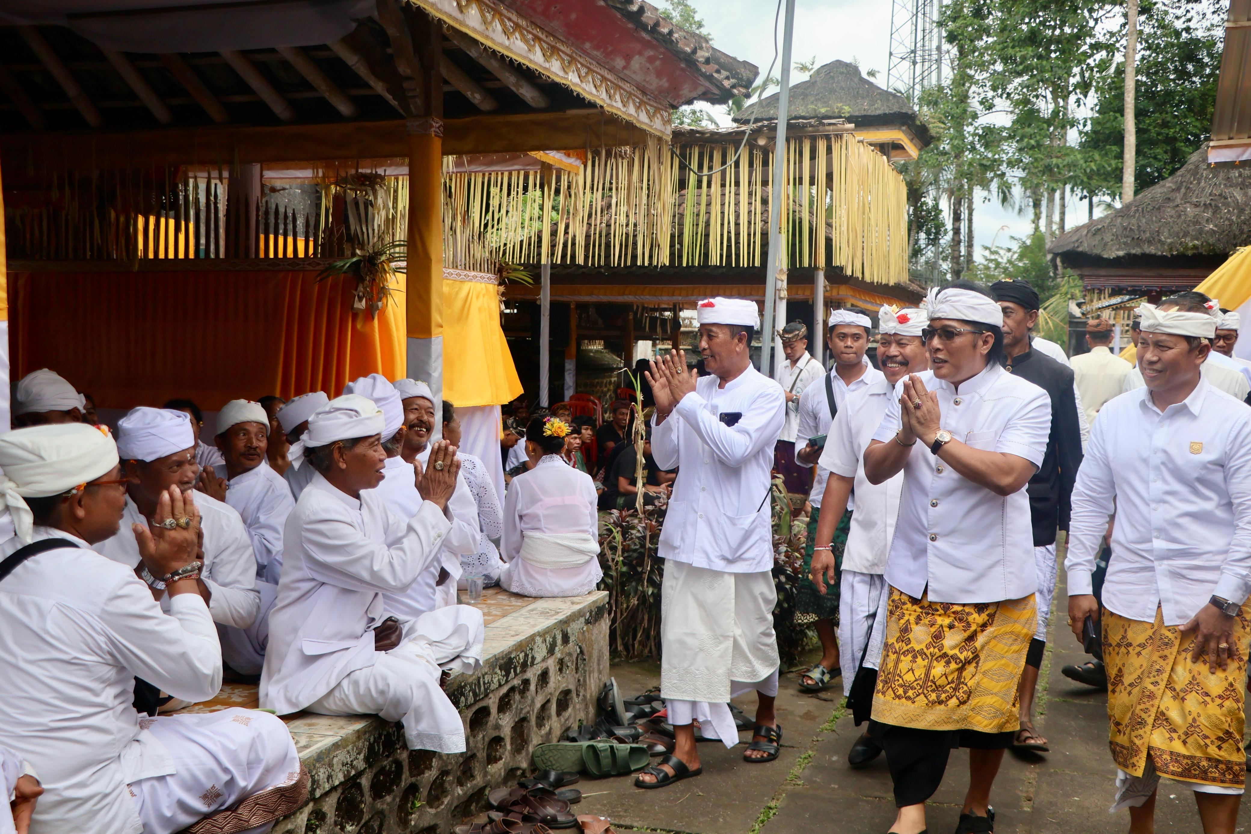 KARANGASEM – Wakil Gubernur Bali, I Nyoman Giri Prasta, memberikan apresiasi terhadap pelaksanaan Karya Tawur Agung Tabuh Gentuh Pedudusan Agung, Suda Bumi, dan Yama Raja yang puncaknya akan berlangsung pada 3 April mendatang. Dalam kesempatan tersebut, Wagub Giri Prasta menyampaikan kebanggaannya atas kebersamaan dan kekompakan warga dalam melaksanakan karya tersebut. "Saya sangat bangga dengan keeratan pesametonan krama di sini, bangga dengan rasa menyama braya yang kuat, sehingga mampu memikul tanggung jawab untuk melaksanakan karya tawur agung. Dengan rasa saling memiliki dan bekerja sama tentu akan menjadikan pekerjaan lebih ringan, dan lebih cepat tertangani. Dengan rasa saling asah, asih dan asuh salunglung sabayantaka, saya yakin akan mampu menjaga dan melestarikan kehidupan kita yang berdasarkan atas agama, adat-istiadat, seni dan budaya," ungkapnya saat memberikan sambrama wacana sesaat setelah melaksanakan persembahyangan bersama di Pura Puseh Desa Adat Geriana Kangin, Desa Duda Utara, Kecamatan Selat, Karangasem, Anggara Pon-Warigadian, Selasa (1/4). Karya yang telah dipersiapkan sejak satu bulan lalu ini melibatkan seluruh krama adat dari tujuh banjar yang ada. Dengan jumlah 460 kepala keluarga, karya ini dilakukan dengan semangat sinergi, kolaborasi, dan gotong royong antar warga. Karya ini nyejer hingga 5 April mendatang. Karya Tawur Agung Tabuh Gentuh Pedudusan Agung, Suda Bumi, dan Yama Raja ini dilaksanakan sebagai rangkaian dari piodalan pura setempat, dengan tujuan untuk menyeimbangkan kekuatan sekala dan niskala. Dalam upacara ini digunakan sarana seekor kerbau, yang diharapkan mampu membawa kedamaian bagi warga dan lingkungan sekitar. "Kita jaga taksu wilayah desa ini dengan hidup rukun berdampingan, baik antara sesama manusia dengan lingkungan atau alam semesta, manusia dengan manusia dan terutama hubungan harmonis antara manusia dengan Tuhan, sebagai sang pencipta," ungkap Jro Mangku Sudarmayasa selaku Pasek/Bendesa Desa Adat Geriana Kangin. Sebagai bentuk dukungan, Wagub Giri Prasta menyerahkan dana punia pribadi sebesar Rp25 juta untuk kelengkapan upakara.